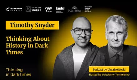 Snyder, the very prototype of the engaged intellectual, is author of several innovative (and controversial) books about Holocaust history, and more recently of the titles “On Freedom” and “On Tyranny: Twenty Lessons from the Twentieth Century.” (Here is a link to his Substack feed.) In each of the recorded appearances, Snyder and his audience, though speaking English, he sometimes breaks off into fluent Ukrainian, which seems less a case of his showing off than of expressing his deep sense of identification with his Ukrainian audience, whom he has journeyed into a war zone to meet. In one from a year ago, he conversed with an audience at an unnamed location in Kharkiv about the meaning of “freedom,” the subject of his most recent book. No less exhilarating and profound was this past October’s conversation of Snyder and Yermolenko about the former’s understanding of the very concept of “history.”
