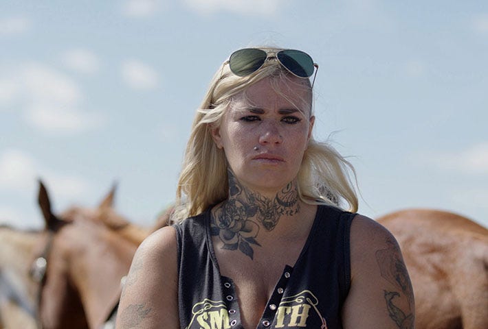 “East of Wall” was the most surprising movie I’ve seen in years. It is director and screenwriter Kate Beecroft’s first feature, and it’s based on the true story of the Wall, South Dakota, horse ranch owned and operated by Tabatha Zimiga. Zimiga’s ranch doubles as a safe refuge for a bunch of teens and young adults for whom living at home is no longer an option. And she herself is “at risk,” as her husband and business partner has recently died, and she is struggling to hold it all together.