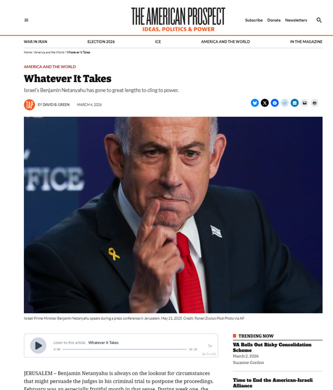 I published this piece in The American Prospect last week. Considering that it deals with Benjamin Netanyahu’s government’s assault on Israel’s legal institutions, and the connection of that assult to the prime minister’s endless criminal trial, you might suspect — correctly — that I wrote most of it before the start of the (latest) war with Iran. I did update the piece before it went to press, of course, but I would argue that the war itself is completely in keeping with the portrait of Netanyahu that is presented in the article.